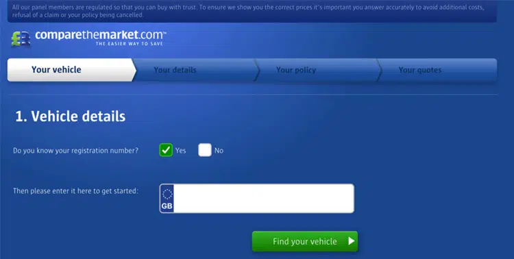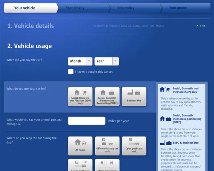 Notre cerveau analyse beaucoup plus rapidement les images que les textes. Pour augmenter la rapidité de complétion de vos formulaires, et donc l’expérience utilisateur, il n’est pas inutile d’intégrer des repères visuels colorés ou des icônes dans vos formulaires. Voici un exemple (Comparethemarket) :