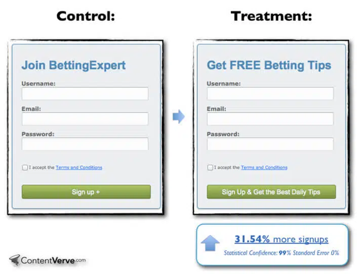 Betting Expert a réussi à obtenir 31,54% de réponses en plus en changeant l’intitulé du formulaire (« Join BettingExpert » ==> « Get Free Betting Tips »). Pensez à bien travailler l’intitulé du formulaire !