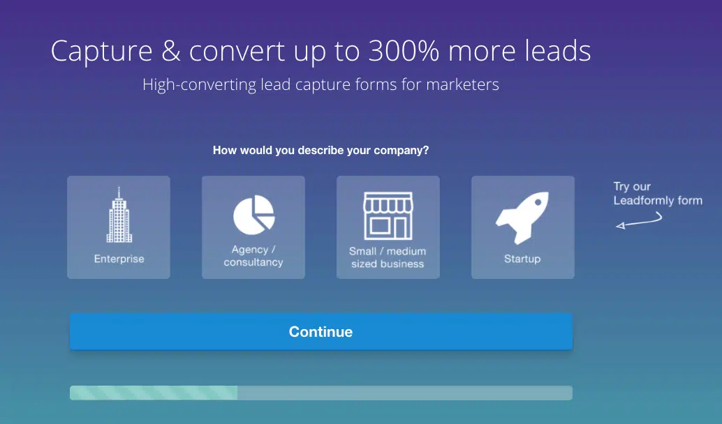 La barre de progression encourage les utilisateurs à compléter le formulaire et leur permet de se faire une idée claire de la longueur du formulaire. Le fait d’utiliser une barre de progression animée (comme sur le site Leadformly) permet d’accroître encore plus les performances.