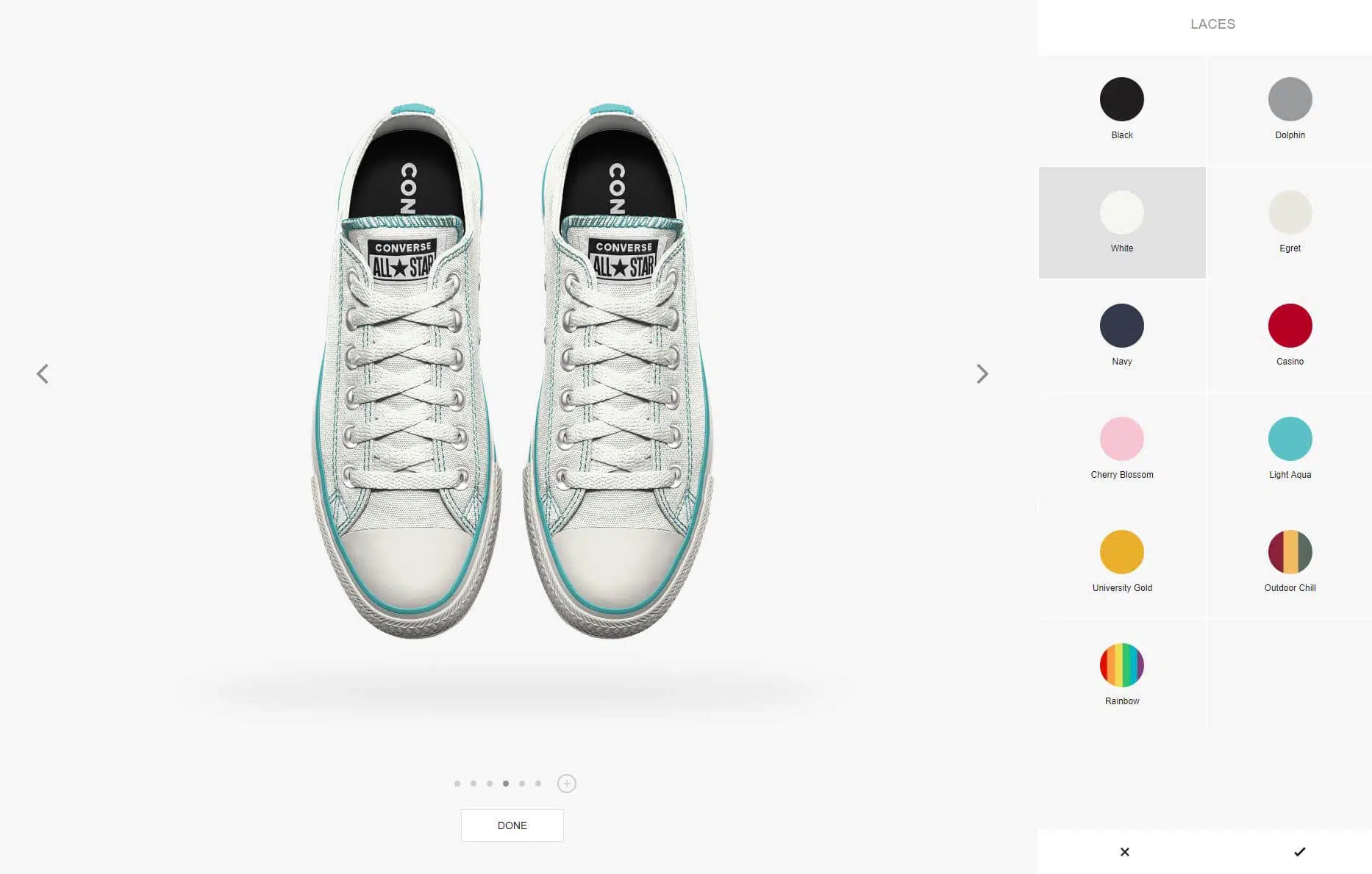 - Offrir la possibilité aux internautes de personnaliser les produits. Pour créer de l’engagement et augmenter la durée moyenne de consultation de vos pages, pourquoi ne pas proposer aux internautes de personnaliser leurs futures emplettes ? Bien évidemment, cela dépend du type de produits vendus. Converse a été l’un des précurseurs en permettant à ses clients de créer des chaussures aux coloris de leur choix. Non seulement l’opération de communication a attiré du trafic mais le taux de conversion a augmenté et le référencement des pages a été amélioré, l’expérience « unique » offerte aux visiteurs ayant fait mouche.