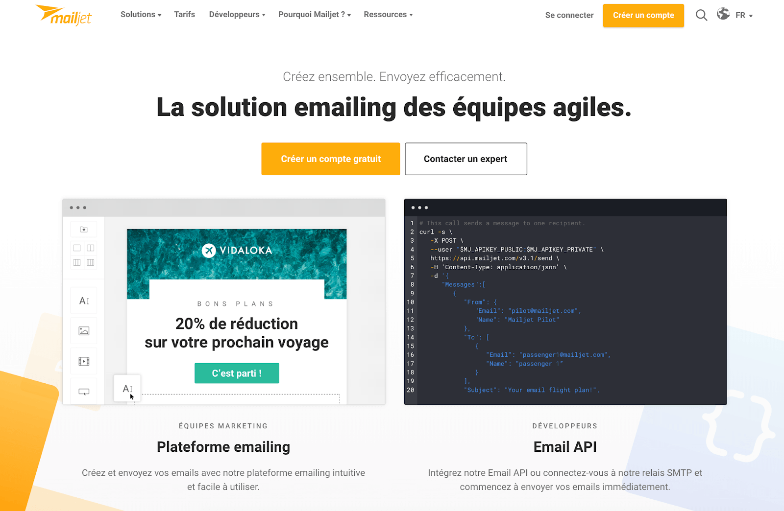 Mailjet est une solution d’emailing positionnée à ses débuts sur les emails transactionnels, mais proposant désormais une plateforme d’emailing tout-en-un (transactionnel + marketing). La qualité de son interface d’utilisation est un des gros points forts de Mailjet sur ses concurrents. Mailjet a été fondé en 2010 par Julien Tartarin et Wilfried Durand et lancé en 2011. Le logiciel est très apprécié des développeurs, en raison de la richesse de son API. Mailjet fait partie des solutions d’emailing les plus reconnues en Europe.