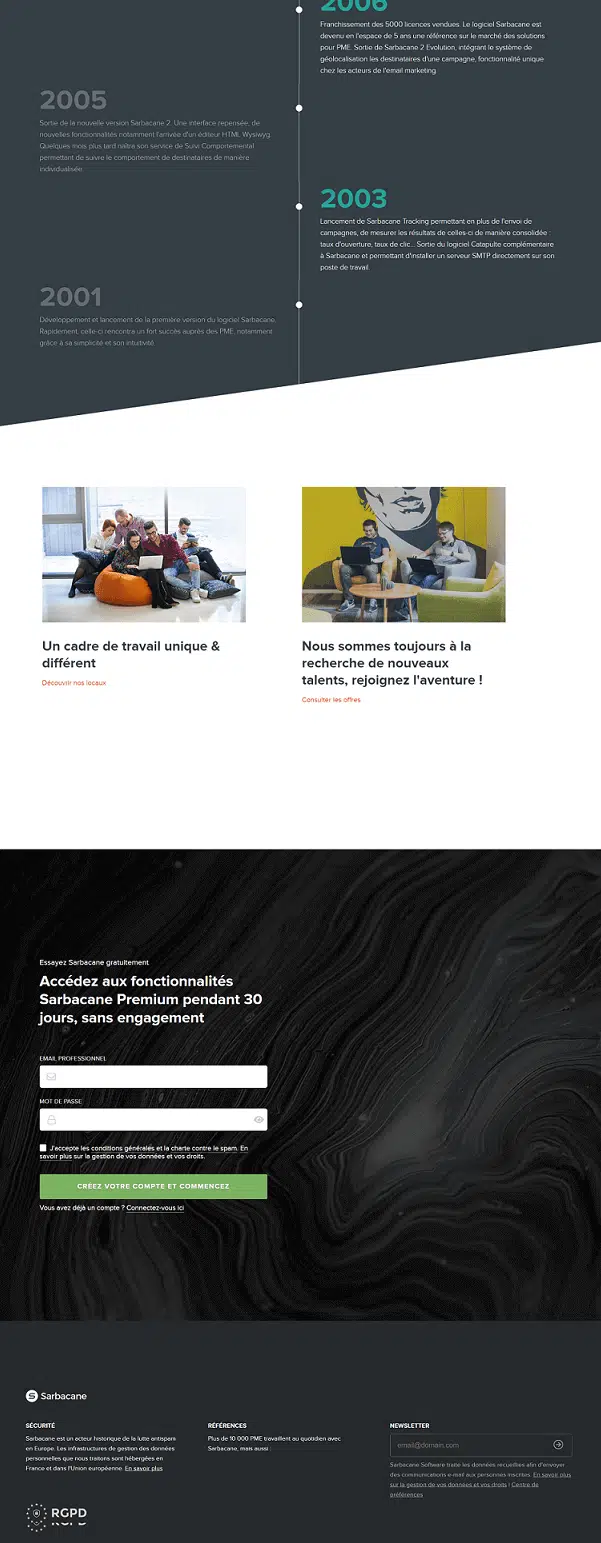 La page « à propos », si cette dernière est bien construite, vous permettra d’inciter vos internautes à s’inscrire à votre newsletter. Vous devez donc vraiment travailler cette page. Voici un exemple, avec la page « À propos » d’un logiciel d’emailing. L’intégration d’un formulaire de newsletter en bas de cette page reste une pratique courante, et de nombreux outils modernes (comme Brevo, MailerLite ou HubSpot) facilitent cette intégration.