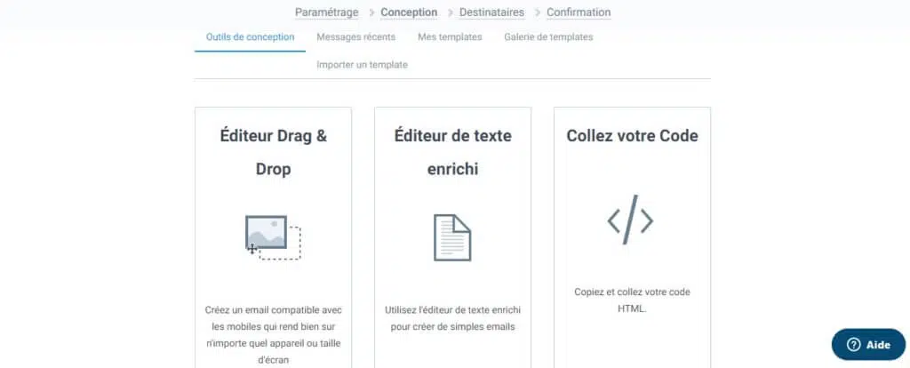 Vous pourrez choisir entre l’éditeur « drag & drop » (glisser-déposer), qui permet une personnalisation avancée et une conception responsive adaptée aux mobiles, ou l’éditeur de texte enrichi pour intégrer votre propre code HTML. Brevo propose également une large bibliothèque de templates modernes, régulièrement actualisés, classés par secteur d’activité et objectif marketing. Cette approche s’aligne sur les standards actuels où l’accessibilité mobile et la personnalisation dynamique sont devenues essentielles. Dans cet exemple, nous allons choisir l’éditeur glisser-déposer.