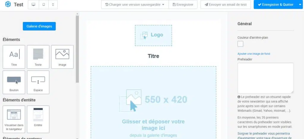 Voici l’écran que vous verrez lorsque vous aurez sélectionné cette option. Sur la gauche, l’ensemble des éléments que vous pouvez inclure dans votre e-mail. Titre, texte, image, bouton mais aussi bloc d’images, réseaux sociaux ou encore copyright. Au centre de l’éditeur, votre newsletter. Titre, logo etc. c’est à vous de décider de l’emplacement de vos différents blocs. Grâce au glisser-déposer, c’est un jeu d’enfant. Enfin, sur la droite, vous pourrez ajouter une couleur en arrière-plan et définir un préheader (un résumé rapide de votre newsletter qui apparaîtra juste après l’objet de votre email). Une fois que vous avez terminé la conception de votre newsletter, vous avez la possibilité d’envoyer un email de test pour vérifier que tout est bien en ordre.