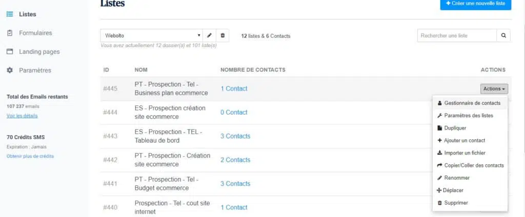 Vous pouvez ajouter tout un tas d’attributs comme le nom, prénom, ville, code postal, téléphone, société etc. Vous pouvez même attribuer un score à chacun de vos contacts en fonction de leur engagement. Dans votre liste, vous pouvez également importer des contacts via un fichier. Les formats .CSV et .TXT sont acceptés, et il est de plus en plus courant de pouvoir connecter directement des outils CRM ou des plateformes tierces via des intégrations natives ou des API, facilitant la synchronisation automatique des contacts. Grâce à Brevo, vous avez également la possibilité de segmenter vos contacts. Cette option est très utile pour, par exemple, ne garder simplement que les contacts ayant ouverts vos emails ou encore pour trouver les emails défectueux. Vous pouvez donc croiser avec une logique ET / OU tous les attributs, et des critères comportementaux.