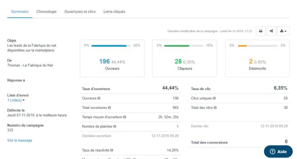 Une chose que nous pouvons affirmer, est que ce rapport est vraiment très complet. En effet, vous pourrez voir des statistiques assez classiques comme le nombre de personne ayant ouvert votre email, le nombre de personne qui ont cliqué sur des liens ou encore le nombre de désinscriptions. Vous avez également accès à des indicateurs avancés, tels que le taux de réactivité (nombre de cliqueurs divisé par le nombre d’ouvreurs), ainsi qu’à des analyses comportementales plus poussées, comme le suivi des parcours utilisateurs, l’analyse de l’engagement sur différents appareils, et des recommandations d’optimisation basées sur l’IA. Les rapports incluent généralement des visualisations interactives et des options de segmentation pour affiner l’analyse des performances.