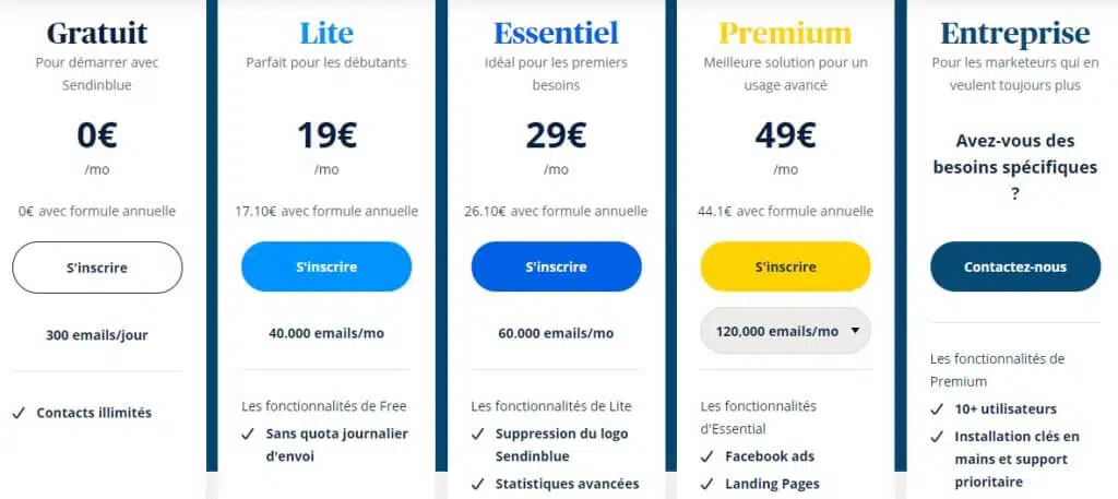 Comme vous pouvez le voir, vous aurez le choix entre 5 offres chez Brevo. Tout d’abord, il est agréable de noter que vous pouvez utiliser ce logiciel gratuitement. Certes, vous serez limité à 300 emails par jour, mais c’est déjà un très bon début pour tester cet outil. Les offres et tarifs de Brevo évoluent régulièrement pour s’adapter au marché. Il est recommandé de consulter directement le site officiel de Brevo pour obtenir les informations les plus à jour concernant les forfaits, les fonctionnalités incluses et les éventuelles limitations. Les formules gratuites et payantes restent disponibles, avec des paliers adaptés à différents volumes d’envoi et besoins professionnels.