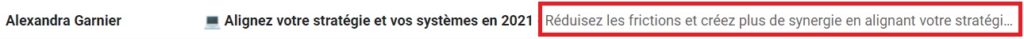 Le texte du pre-header est le texte qui apparaît dans votre message à côté de la ligne d’objet. C’est ce que les destinataires voient après avoir lu l’objet et qui détermine s’ils vont ouvrir (ou non) votre e-mail. Considérez ce texte comme la suite de votre ligne d’objet. Utilisez-le pour développer l’objet et renforcer la curiosité et l’émotion déjà associées à l’objet.