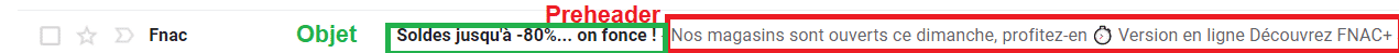 L’objet de votre email et le Preheader (la première ligne de votre e-mail qui va apparaître dans la boîte de réception de votre email) doivent clairement donner envie à votre client d’ouvrir l’e-mail, voire même de passer directement à l’achat ! C’est une phrase d’accroche qui fait toute la différence et attire la curiosité de vos destinataires.