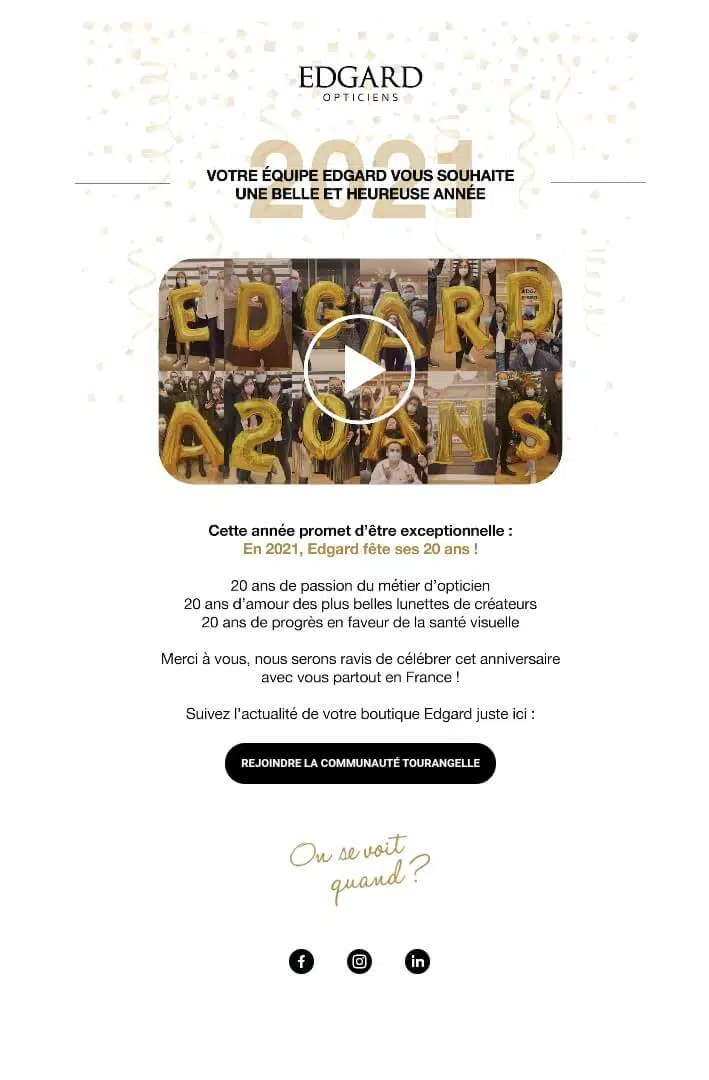 Pour donner un peu de dynamisme à ses vœux, Edgard a choisi d’ajouter une vidéo visible en ligne. Aujourd’hui, l’intégration de contenus interactifs comme des vidéos embarquées, des carrousels ou des sondages directement dans l’email est de plus en plus adoptée pour renforcer l’engagement et offrir une expérience utilisateur enrichie.