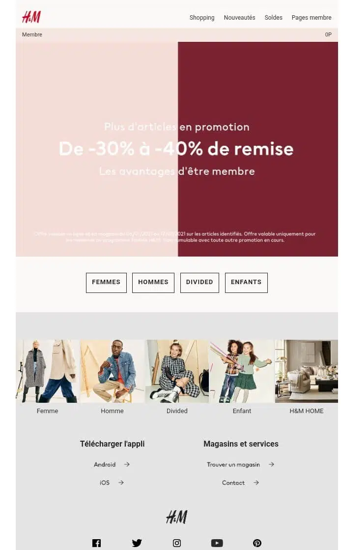 Sur l’emailing de l’offre VIP de la marque de prêt-à-porter H&M, il n’y a pas de blabla, on voit tout de suite l’offre qui nous attend lorsque nous sommes membres du programme de fidélité.