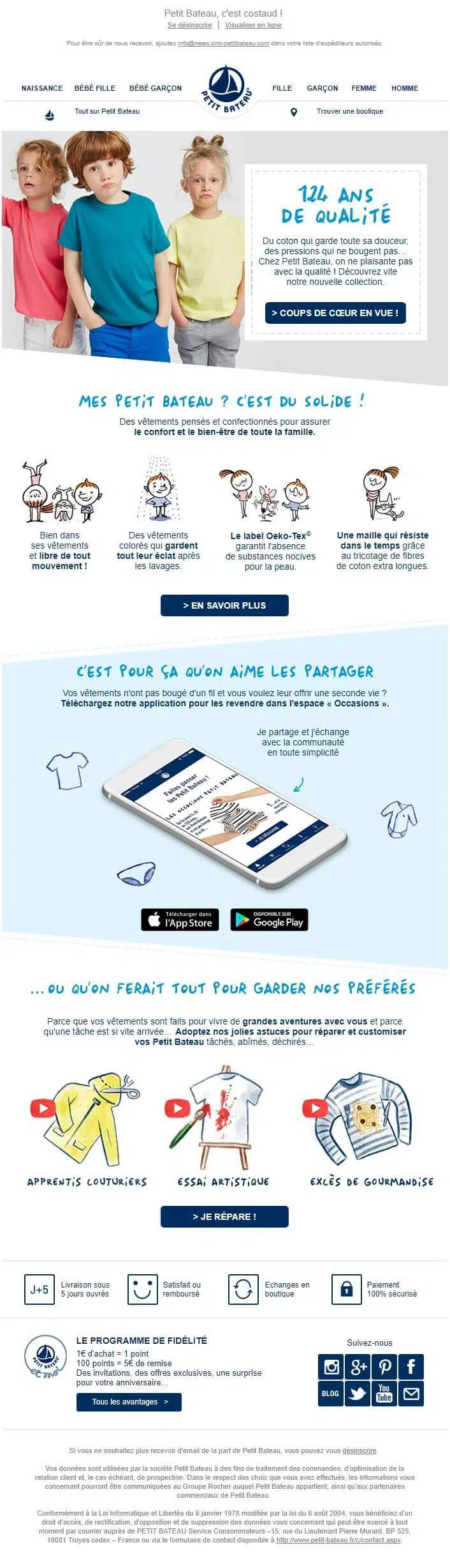Dans son courriel, Petit Bateau nous rappelle la qualité de ses vêtements, et nous donne même quelques astuces pour les détacher ou les repriser. Par cet emailing, la marque n’a pas forcément pour objectif d’inciter à l’achat immédiat, mais plutôt de réengager les consommateurs déjà convaincus par les produits en rappelant ses points forts.