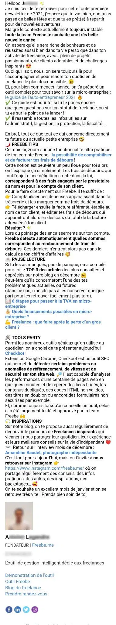 Dans sa newsletter, l’entreprise Freebe qui propose des outils de gestion à destination des microentreprises, s’adresse directement à son destinataire. Elle l’appelle par son prénom et le tutoie.