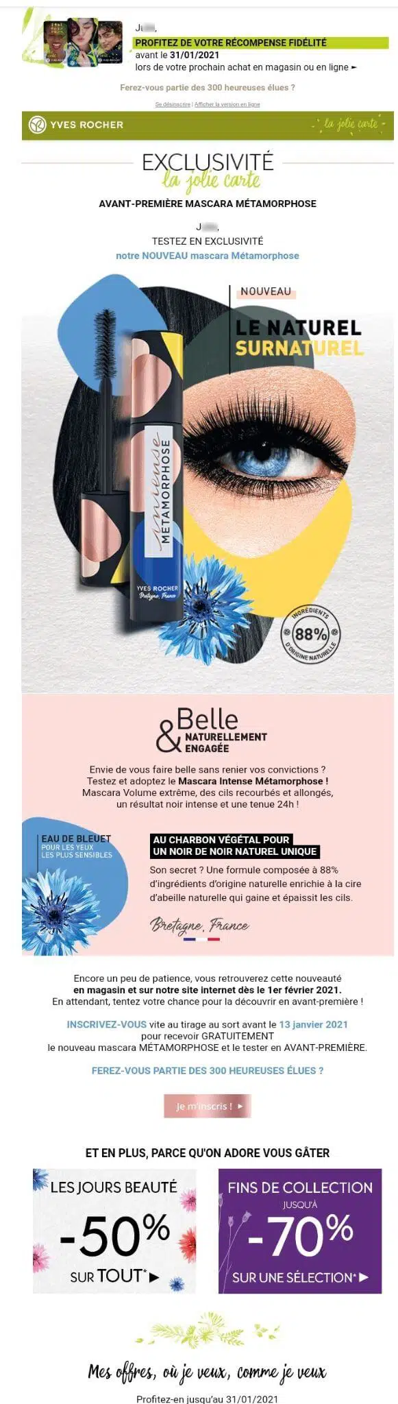 D’entrée de jeu, dans cet exemple de campagnes emailing, Yves Rocher s’adresse à son client par son prénom, et le/la remercie pour sa fidélité. La présence du CTA (Call to Action) « testez en exclusivité notre nouveau mascara » incite les clients à se rendre sur le site pour découvrir la dernière nouveauté.