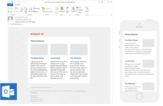 Email on Acid est un logiciel de testing d’emails bien connu. L’équipe d’Email on Acid a créé un template email responsive adaptable en fonction de vos besoins. Le template s’affiche en une, deux ou trois colonnes en fonction de la taille de l’écran de lecture. Ce que nous apprécions particulièrement dans ce template, c’est la variété des tailles d’écran supportée. Votre email s’affiche correctement, indépendamment de la taille de l’écran.