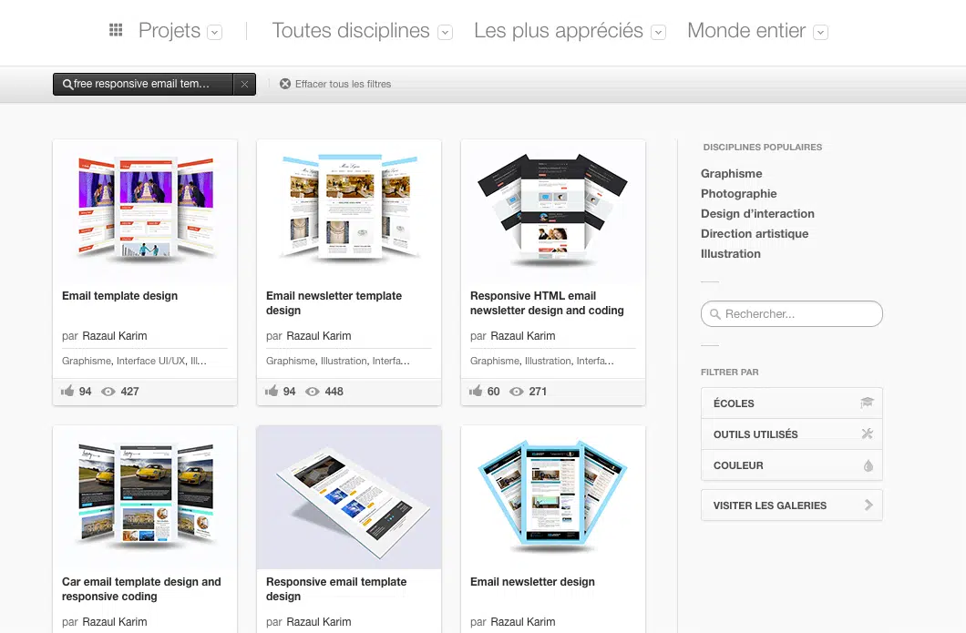 Behance est une plateforme de partages de projets et de portfolios à destination des designers. On peut y découvrir tous types de projets, y compris des projets de nature artistique. En tapant « free responsive email templates » dans le moteur de recherche du site, vous découvrirez de nombreux templates email gratuits partagés par la communauté.