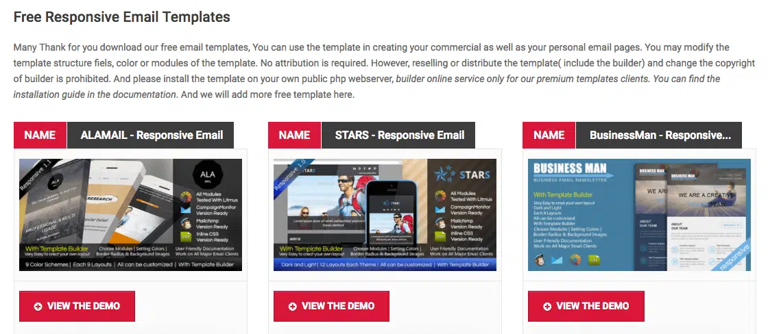 Jenna Molby’s partage sur son site de nombreuses astuces utiles en matière d’email marketing. Elle propose également six templates email responsive gratuits, facilement personnalisables en fonction de vos besoins. Chacun des templates présente un design unique. Ils ont tous été testés et sont supportés par les principaux clients de messagerie. Vous pouvez prévisualiser le template sélectionné avant de le télécharger.