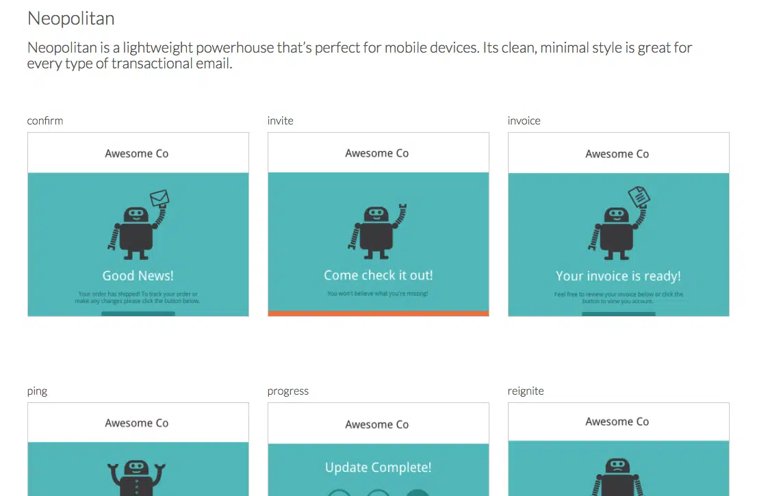 Sendwithus est un autre site très intéressant pour découvrir de nouveaux designs d’emails responsive. Vous avez accès à 14 templates email gratuits. Par contre, vous ne trouverez pas de templates de newsletters. Il n’est ici question que d’emails transactionnels. Ces différents templates sont supportés par la majorité des clients de messagerie. Chaque template est disponible en 9 versions personnalisées, ce qui démultiplie le choix.