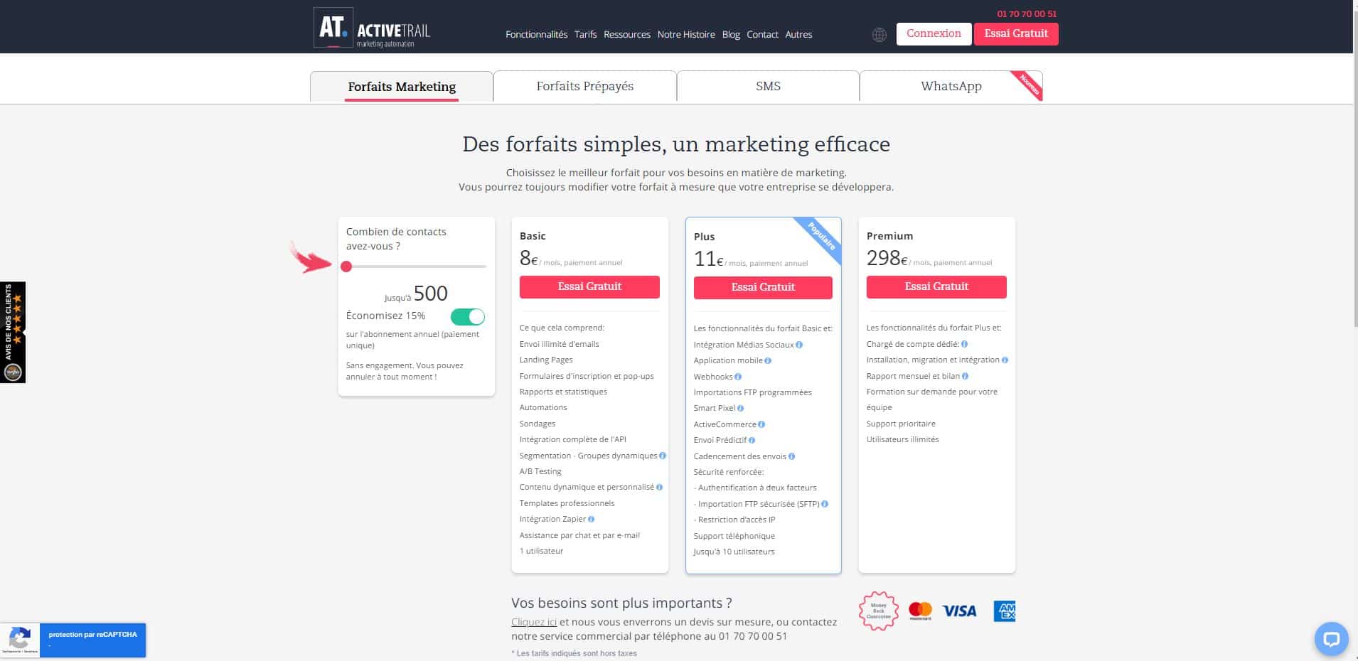 Les formules d’ActiveTrail sont simples à comprendre : trois niveaux, tous accessibles avec un essai gratuit, et des prix clairs selon le nombre de contacts.