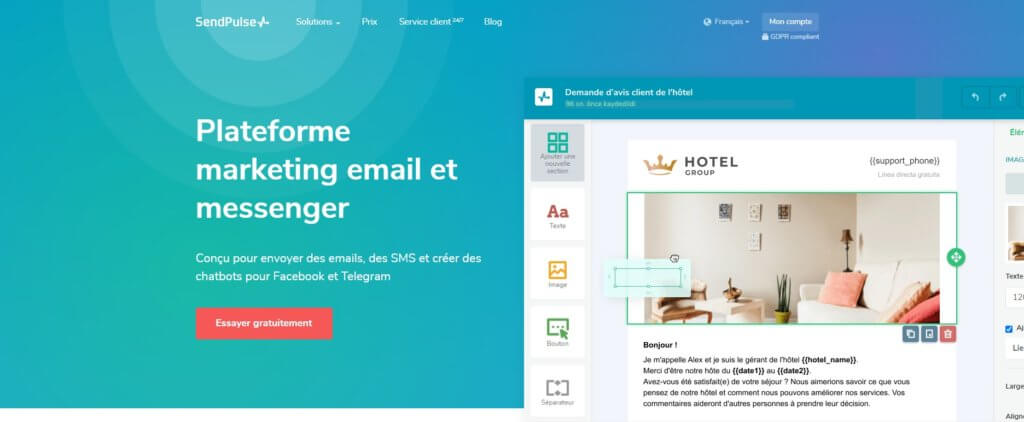 Boostez votre marketing avec SendPulse : votre solution tout-en-un pour des campagnes digitales percutantes. Profitez de l’automatisation sur emails, SMS, et notifications push, créez facilement avec des modèles d’email attractifs et engagez vos clients via des chatbots sur leurs réseaux favoris. Tout cela, en restant conforme au RGPD et avec un support client toujours à l’écoute. Cliquez pour transformer votre communication digitale !