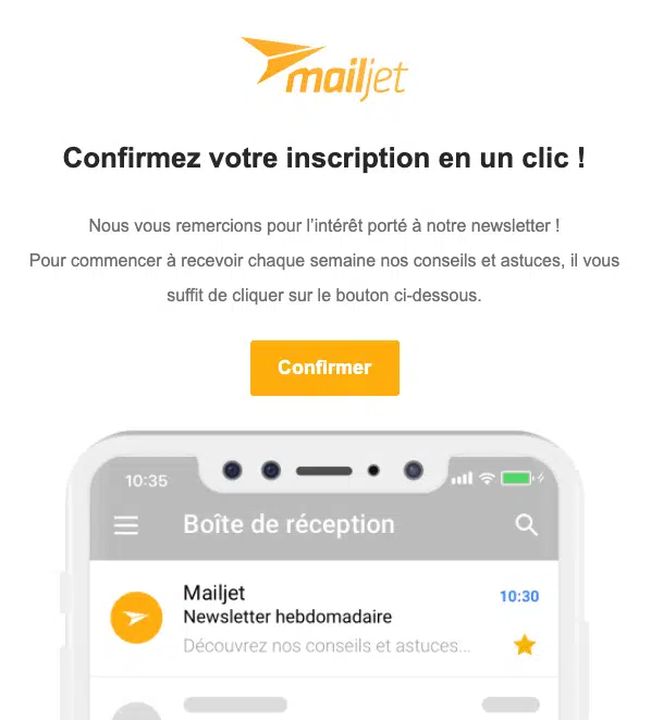 Le confirmed opt-in lite chercher à combiner les avantages des deux approches. Si un utilisateur renseigne son adresse email via le formulaire d’abonnement à la newsletter, le premier email qu’il recevra en retour sera soit la prochaine campagne de la marque, soit un email de bienvenue automatiquement envoyé par l’entreprise après toute inscription. À ce stade, rien ne différencie encore le confirmed opt-in lite du single opt-in. Le destinataire n’a pas eu besoin de valider son inscription en cliquant sur un lien de confirmation.