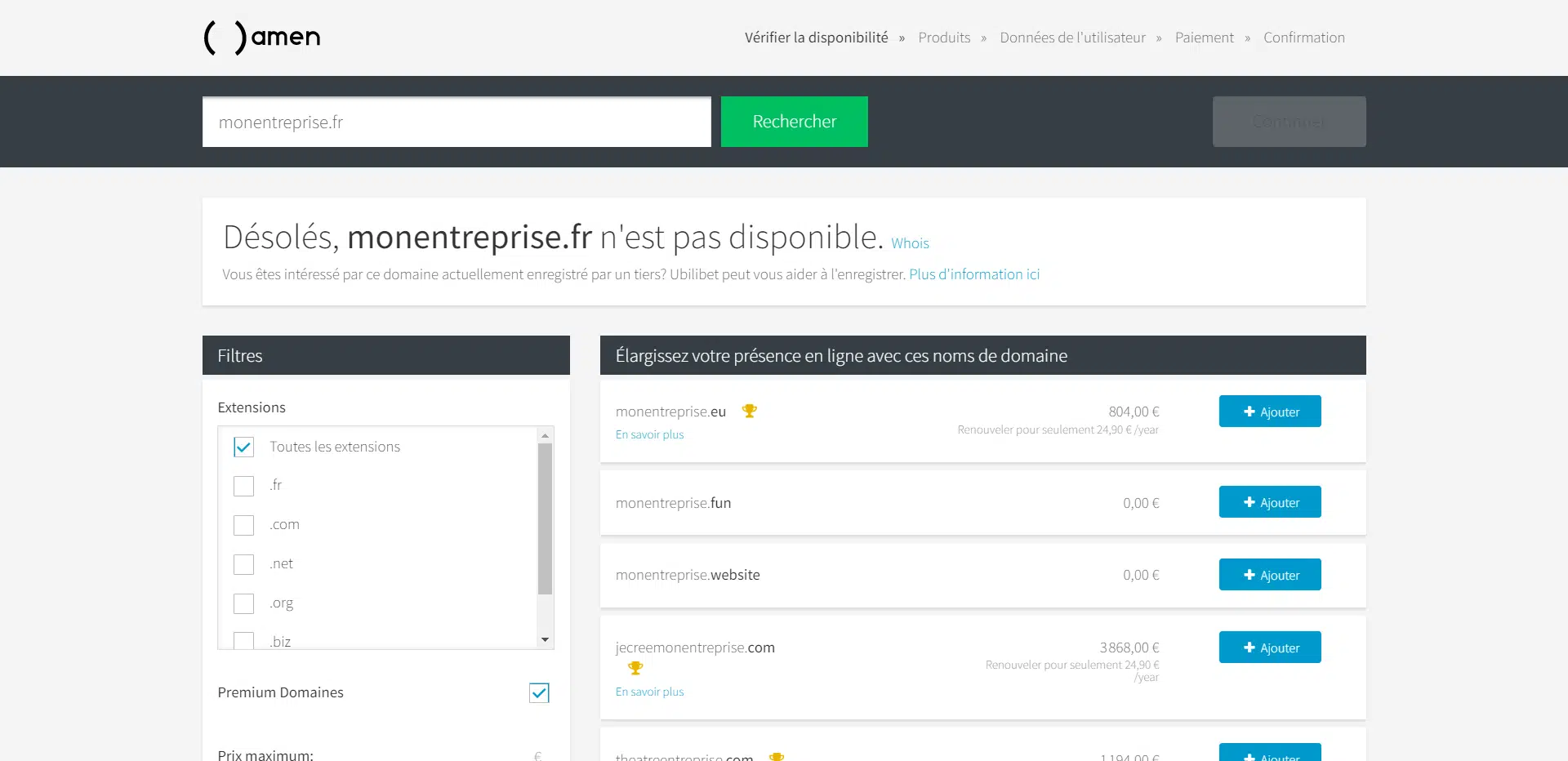 Si votre nom de domaine est déjà utilisé, Amen.fr vous proposera des alternatives. Elles peuvent prendre la forme d’un nom de domaine très similaire, avec une extension différente, ou être transformée plus profondément afin de se distinguer clairement des autres noms de domaines existants. Vous pouvez sélectionner un nom de domaine alternatif dans la liste proposée, ou en trouver un autre par vous-même et tester sa disponibilité.