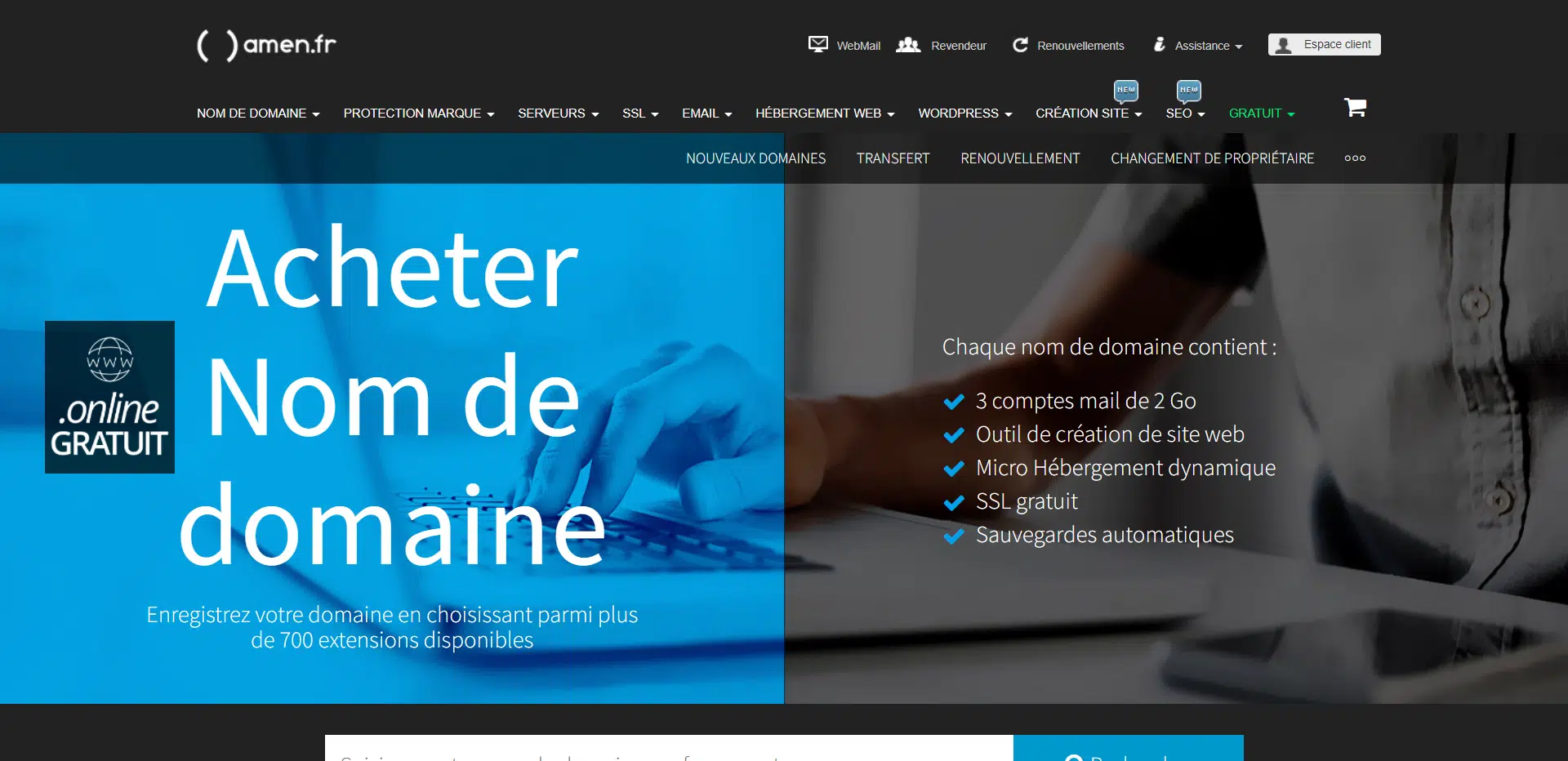 Après la théorie, voici la pratique ! Nous avons choisi de vous montrer concrètement comment se déroule l’enregistrement et comment acheter nom de domaine sur la plateforme simple et efficace Amen.fr.