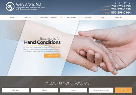 Ce dont il faut s’inspirer : de belles couleurs, de beaux graphismes / images. Mise en page propre et moderne. L’image de la page d’accueil vous permet de connaître immédiatement le type de médecin. Informations de contact facilement disponibles. Dr. Arora a une très bonne page « à propos de nous ». Il a également des call-to-action bien visibles (mais pas trop) pour encourager les demandes de rendez-vous.