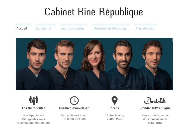 Ce dont il faut s’inspirer : le site est aussi bien travaillé que le look des thérapeutes. Il est clair, moderne et donne les informations pratiques agrémentées de pictogrammes. Le site possède également beaucoup de photos du cabinet ou des techniques utilisées pour soigner les patients. Le bouton de réservation sur Doctolib (ou d’autres plateformes de prise de rendez-vous en ligne reconnues) est mis en avant, ce qui permet de faciliter la prise de rendez-vous.