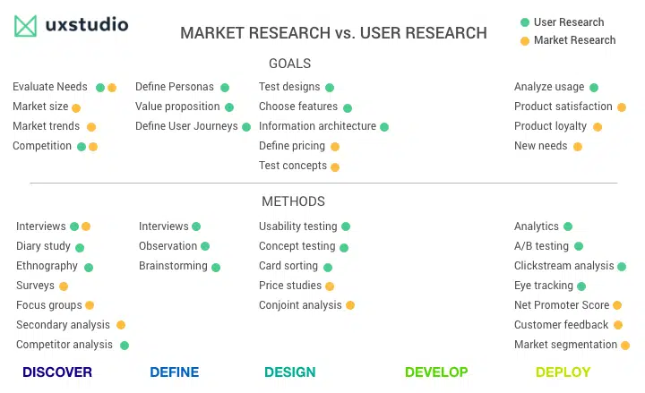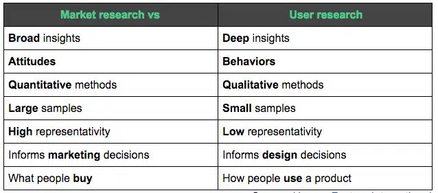 Les études de marché consistent principalement à obtenir une vue d’ensemble et à découvrir des informations de haut niveau concernant un secteur spécifique. Les études de marché utilisent principalement des méthodes quantitatives, c’est-à-dire qu’elles se concentrent sur les chiffres. Ils mènent des études sur de grands échantillons représentatifs afin d’en déduire des résultats pour l’ensemble de la population. Les résultats des enquêtes reflètent la situation de la population dans son ensemble avec une marge d’erreur acceptable. Cela peut nous assurer de l’âge moyen de l’utilisateur potentiel, de son niveau de revenu, de son niveau d’éducation et d’autres caractéristiques générales. Les études de marché ont tendance à donner plus de poids aux données comportementales (ce que les gens disent d’eux-mêmes ou de ce qu’ils feraient) plutôt qu’à des comportements concrets dans un certain contexte. Ils utilisent les informations tirées d’études de marché principalement pour éclairer leurs décisions.