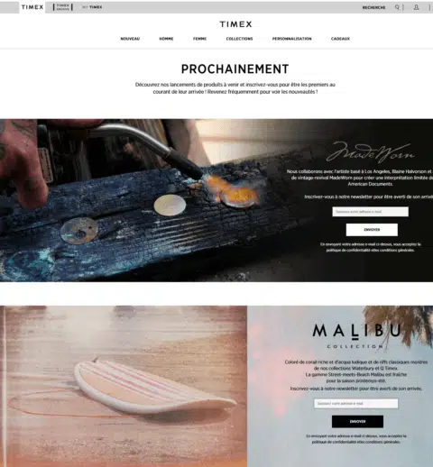 Sur sa landing page, Timex met en avant ses prochaines collections de montres et invite les visiteurs à s’inscrire à la newsletter afin d’être informés en priorité du lancement de chaque nouvelle gamme.