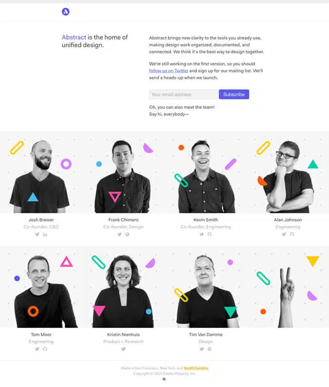 La landing page de pré-lancement d’Abstract est un très bon modèle si votre projet est encore loin de sa commercialisation. Ils ne sont pas rentrés dans les détails techniques de leur produit à venir, mais ils ont décidé de mettre en avant leurs objectifs.