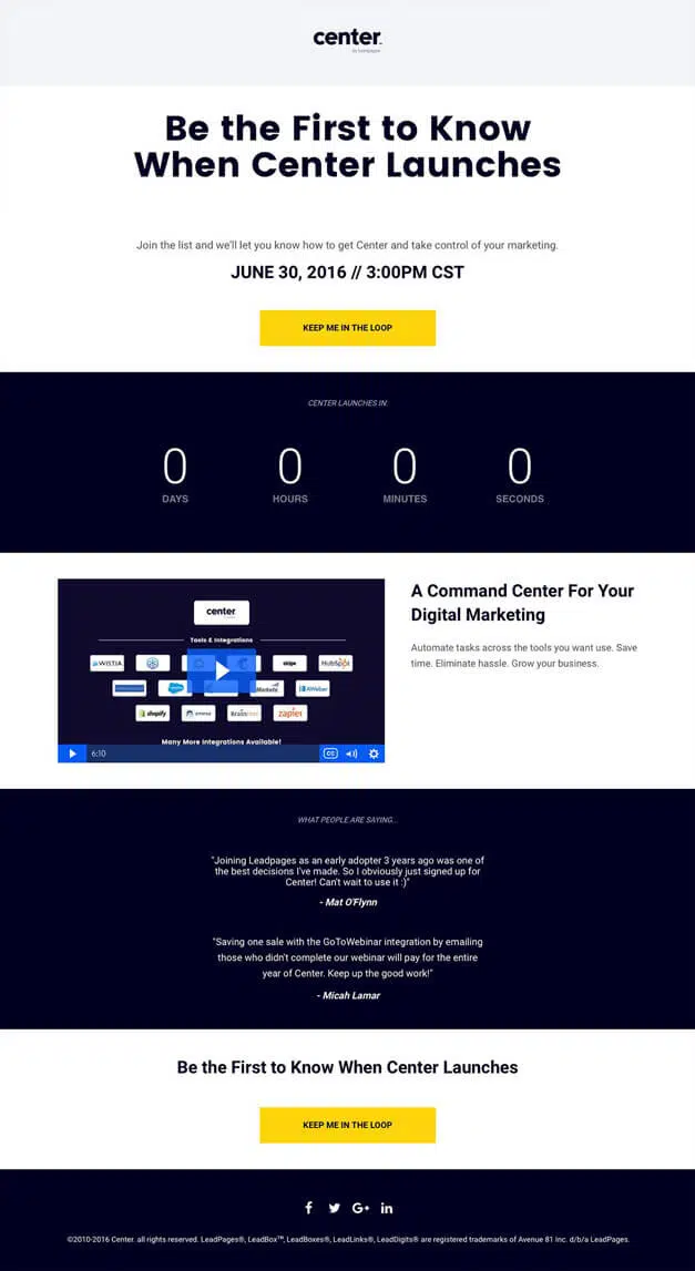 Parmi nos exemples de landing pages, Center offre une page de pré-lancement très complète. Elle repose sur un titre attrayant, et sur le CTA mis en valeur en jaune, proposant aux clients d’être tenu au courant du lancement du nouveau produit.