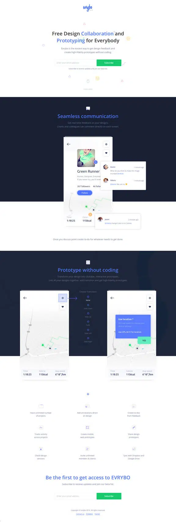 Evrybo a placé son CTA en haut de sa landing page, c’est idéal pour que les visiteurs le remarque, et s’y inscrive immédiatement s’ils n’ont pas envie de consulter la page entière.