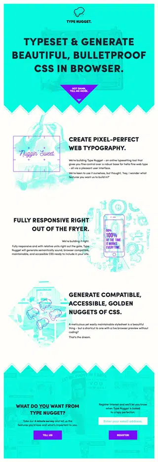 Type Nugget est l’un des exemples de landing pages les plus intéressants car il s’adresse à une clientèle spécifique. C’est un outil d’aide à la conception de typographie pour la création de sites web. Le titre est direct, et l’on comprend immédiatement ce que Type Nugget va proposer. Ils invitent ensuite leurs visiteurs à en découvrir davantage sur la solution avec une pointe d’humour grâce à l’onglet « Oh Shit, tell me more ».