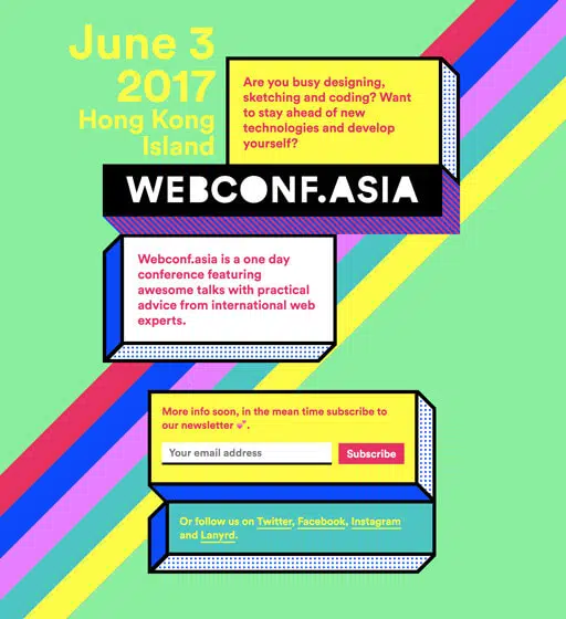 La marque offre enfin la possibilité de s’inscrire pour recevoir des newsletters, et de suivre Webconf.asia sur les réseaux sociaux. Un excellent moyen de convertir les invités potentiels avant même qu’ils aient vu la conférence.