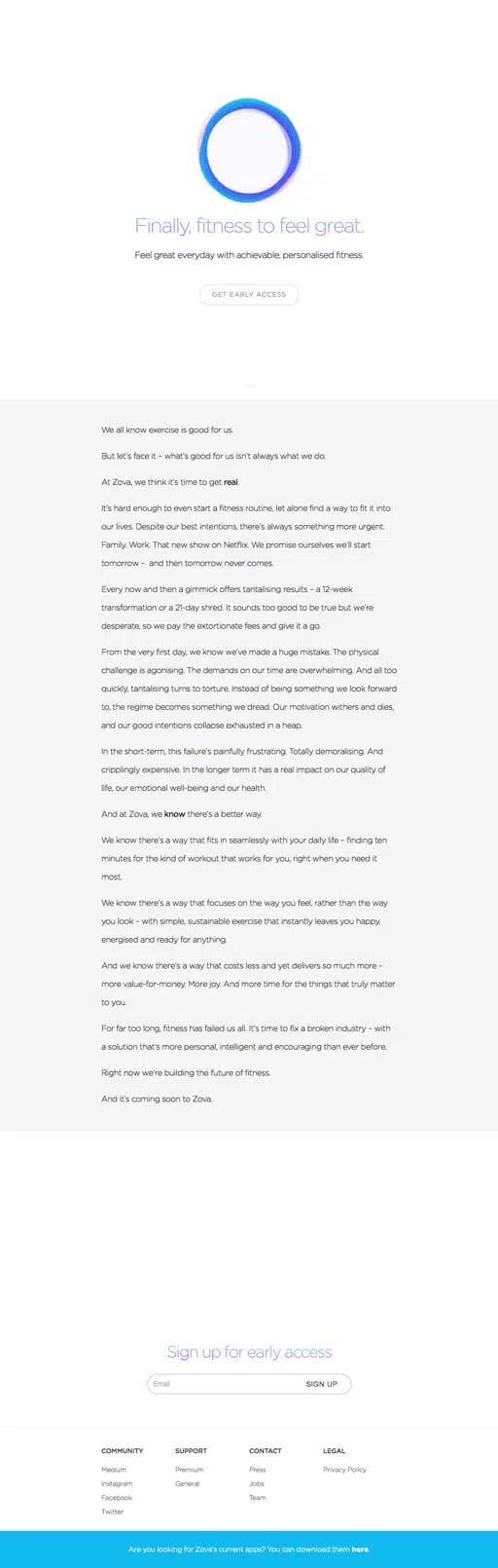 Cette landing page est intéressante car elle expose clairement le problème auquel l’offre répond, et donne les arguments pour préférer Zova aux autres solutions.