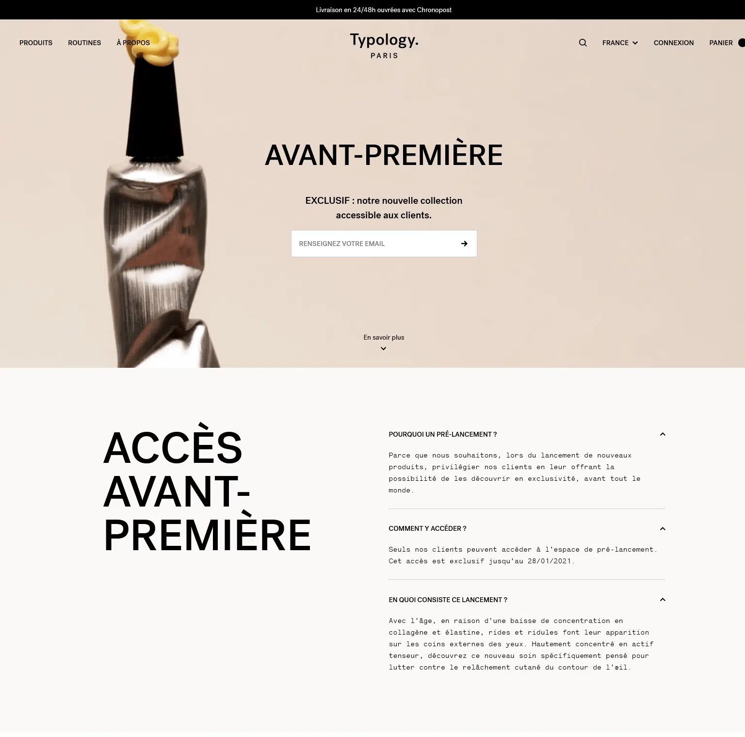 Sur sa landing page, Typology offre à ses clients la possibilité d’accéder en avant-première à une nouvelle gamme de soins. Dès l’arrivée sur la page, les visiteurs peuvent s’inscrire par email pour bénéficier d’un accès exclusif, ou faire défiler la page pour découvrir les avantages réservés aux membres de la liste d’attente.