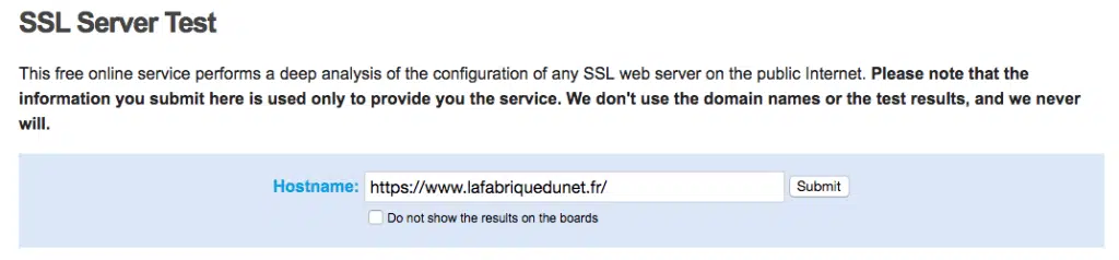 En cas de problèmes rencontrés au niveau du SEO, nous vous conseillons de vérifier dans un premier temps l’installation de votre certificat SSL. il est possible que le problème soit à ce niveau-là. Utilisez pour cela l’outil SSL server test (gratuit) et renseignez l’URL de la page d’accueil de votre site (en HTTPS) dans le champ de recherche :