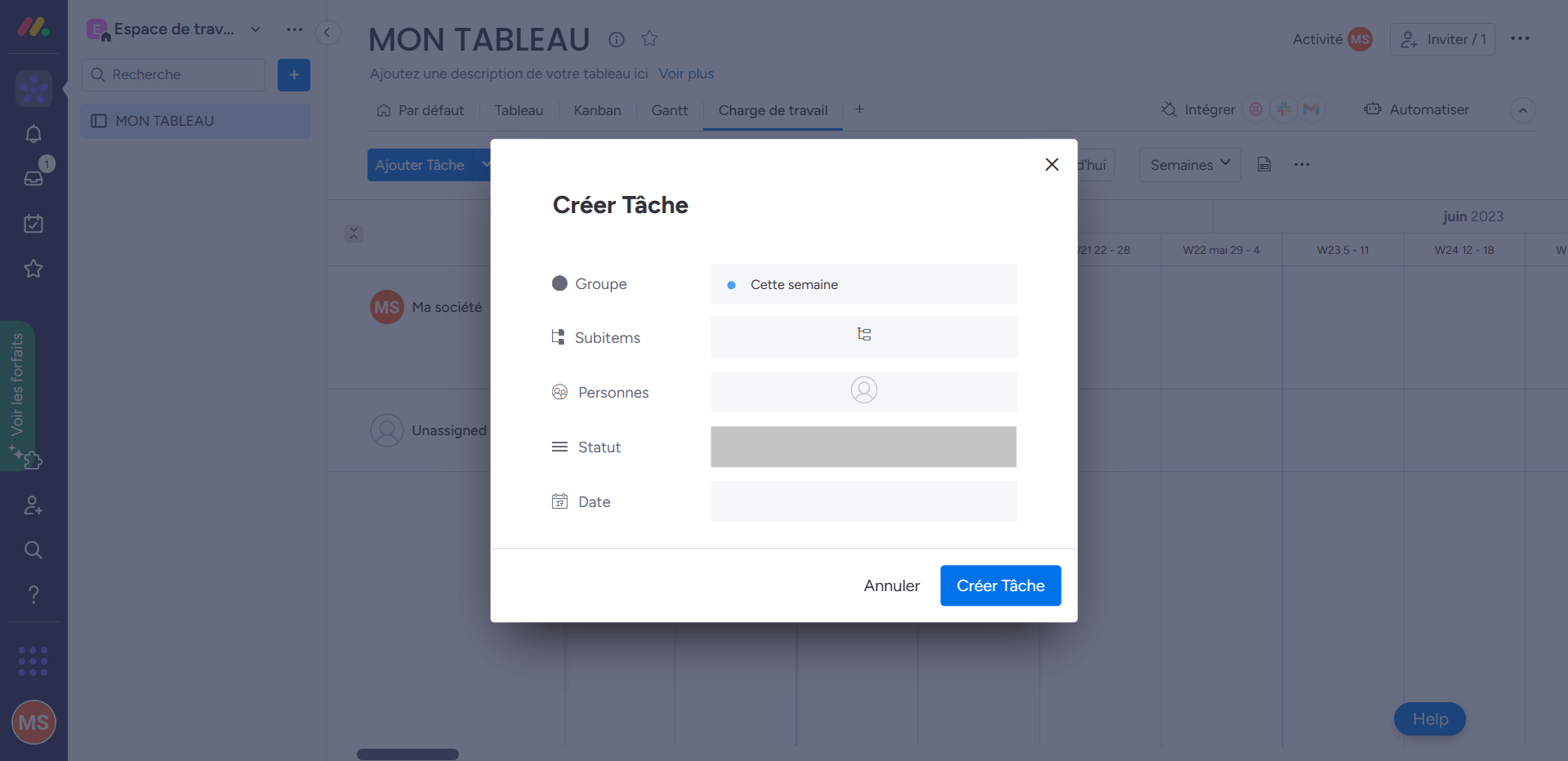 • Personnalisation des vues : Il est simple de passer d’une vue Kanban à une vue Gantt, ou encore d’activer la vue Charge de travail pour mieux répartir les missions.