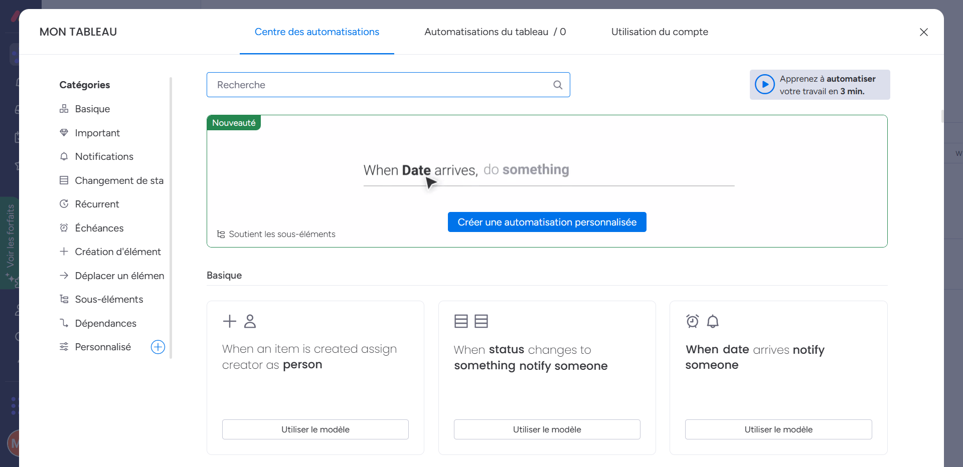 La configuration de ces automatisations est facile car de nombreux déclencheurs et actions courants sont préinstallés. Vous pouvez également filtrer les options d’automatisation pour trouver celle qui convient à vos besoins, ou créer une automatisation personnalisée. En somme, les automatisations de Monday.com vous permettent de gagner du temps et d’optimiser vos processus de travail sans être complexe à utiliser.
