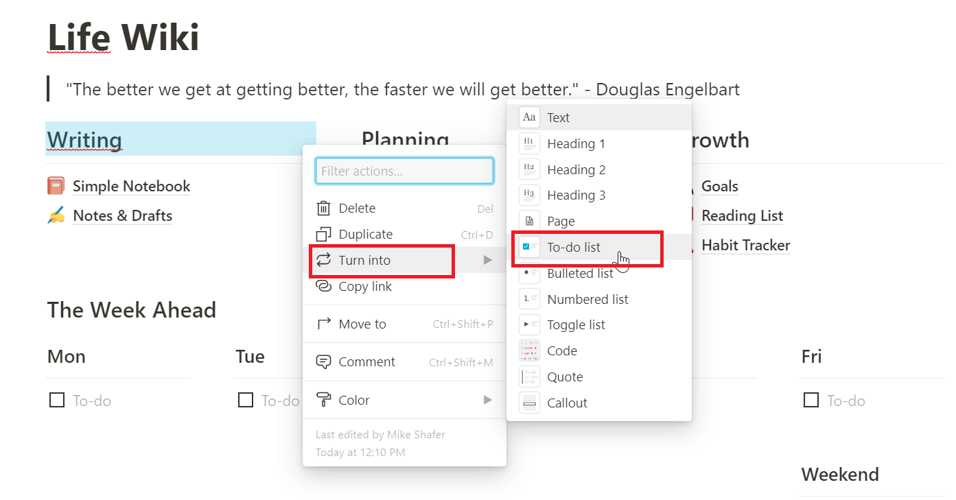 Lorsque vous utilisez l’application, vous découvrirez de nombreuses fonctionnalités intégrées qui peuvent grandement faciliter votre travail. Vous pouvez transformer une simple page en une liste de tâches, un plan ou un rétroplanning, un éditeur de texte brut, ou tout autre élément proposé par l’application.