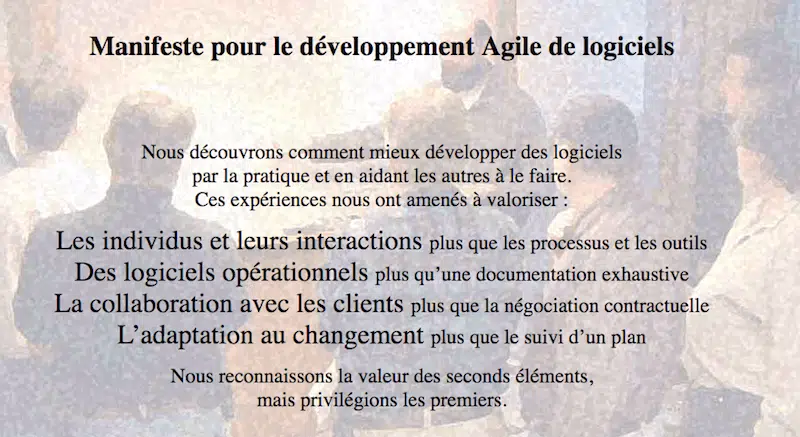 • La « méthode agile », qui a été publiée par un groupe de 17 personnes au tout début des années 2000. Le manifeste de cette méthode, qui explique son fonctionnement et les principes sur lesquels elle se base, est accessible sur le site dédié. La méthode agile est d’abord un état d’esprit qui consiste à mettre l’accent sur les individus plus que sur les process et les outils, sur la performance opérationnelle, sur l’écoute client, sur l’adaptabilité au changement. La méthode agile, plus qu’une méthode détaillée et directement opératoire, est plutôt le cadre axiologique à partir duquel plusieurs méthodes ont été construites : Scrum, Kanban, etc. Une méthode agile se caractérise par un fonctionnement par itérations (sprints), par une évaluation permanente des résultats obtenus, par la capacité de faire évoluer le projet en cours de route pour mieux répondre aux besoins du client, par une communication permanente entre le chef de projet et les parties prenantes (direction, client…).
