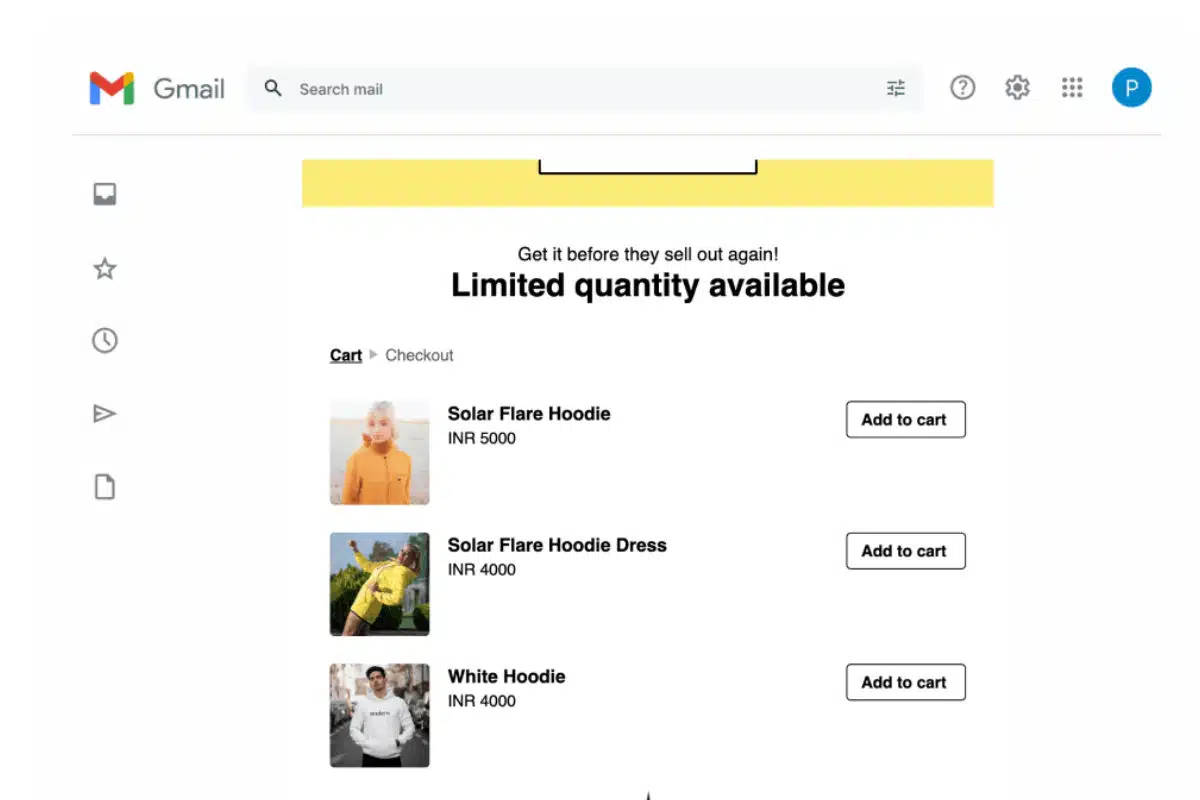 AMP propose quelques modules intégrés tels que des carrousels. La mise en place de ces fonctionnalités dans les emails ne nécessite que quelques lignes de code. Cependant, AMP n’est pas le seul moyen d’intégrer de l’interactivité dans les emails. Vous pouvez créer du contenu interactif assez étonnant simplement en utilisant HTML et CSS.