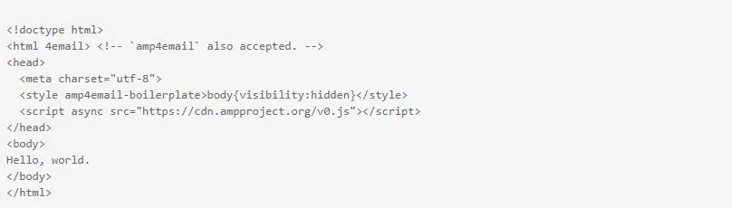 AMP for Email est un sous-ensemble de AMP qui, comme AMP, offre des fonctionnalités de type Javascript pour les emails. Comme tous les clients de messagerie bloquent Javascript par défaut, AMP offre une alternative limitée et sécurisée à Javascript sans donner aux expéditeurs la possibilité d’exécuter du code dans leur courrier électronique. La spécification « AMP HTML pour Email spec » consiste à ajouter une nouvelle partie MIME « text-x-amphtml » à votre adresse e-mail contenant le balisage HTML AMP. Le raisonnement est que les clients de messagerie compatibles AMP rendraient alors cette partie au lieu de la partie HTML et que d’autres clients non-AMP continueraient à rendre la partie HTML. Un e-mail AMPHTML commence par le modèle de base suivant: