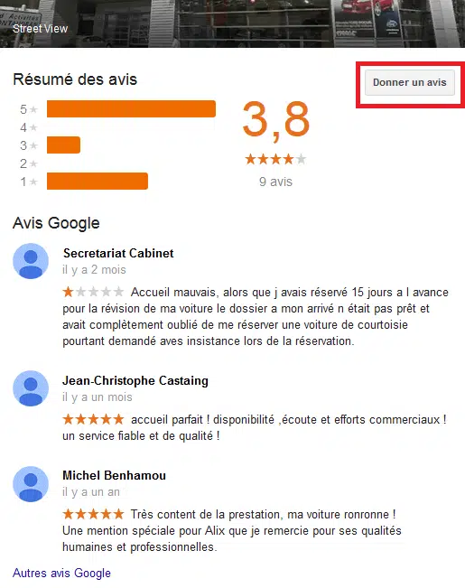 Google My Business permet d’accroître gratuitement sa visibilité sur Google, en étant plus visible sur les recherches locales, grâce au couplage existant entre Google My Business et Google Maps. My Business permet aux internautes de géolocaliser plus facilement votre société, de trouver l’itinéraire pour accéder à votre société grâce à Google Maps, d’accéder plus rapidement à vos coordonnées (adresse postale, téléphone) et à d’autres informations, comme vos horaires d’ouverture. En outre, vos clients, grâce à Google Business Profile, peuvent facilement déposer des avis sur votre entreprise directement via votre fiche Google sur la recherche ou Google Maps :