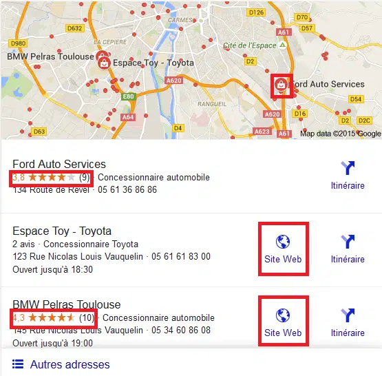 Le bloc Google My Business, qui apparaît dans les SERP, permet aux internautes d’accéder à votre site internet, à des avis clients (note + étoiles), de géolocaliser votre société et d’accéder à l’itinéraire :