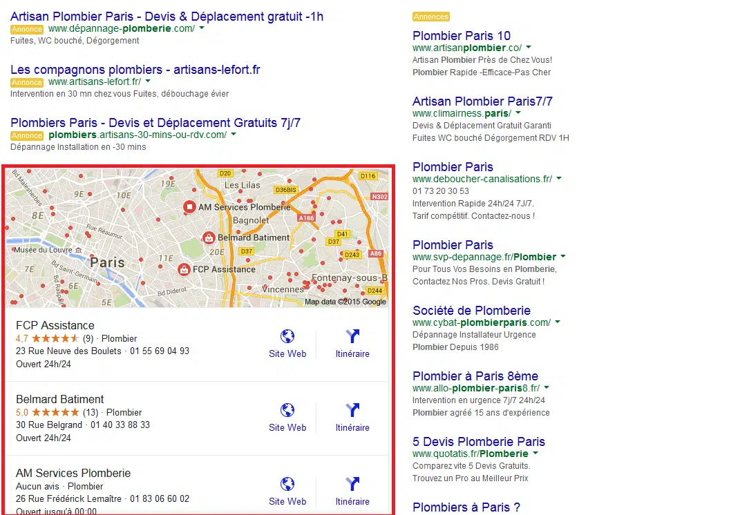 Si vous êtes une entreprise cherchant à gagner en visibilité sur internet, Google My Business est un outil aujourd’hui incontournable. Le référencement classique est bien sûr important. Mais vous aurez remarqué que désormais les recherches locales mettent en avant un bloc comportant une carte et des adresses professionnelles. Ce bloc – le bloc Google My Business – apparaît en haut des résultats de Google, comme le montre l’exemple ci-dessous pour la requête « plombier paris » :