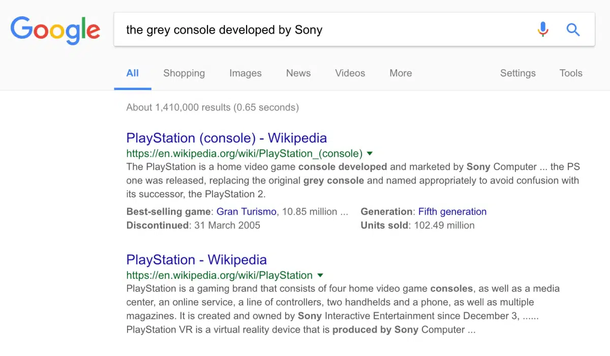 Qu’est ce qui a changé ? Avant, Google essayait de faire correspondre les mots de votre requête aux mots d’une page. Aujourd’hui, RankBrain essaie de comprendre ce que vous voulez dire, comme un humain le ferait. Comment ? En associant des mots clés jamais vus aux mots clés que Google a déjà vus. Par exemple, Google RankBrain a peut-être remarqué que beaucoup de gens recherchent « une console grise développée par Nintendo ». Ils ont appris que les personnes qui recherchent une « console grise développée par Nintendo » veulent voir une série de résultats sur les consoles de jeu. Ainsi, lorsque quelqu’un recherche « la console grise développée par Sony », RankBrain apporte des résultats similaires au mot clé qu’il connaît déjà (« console grise développée par Nintendo »). Donc, il montre des résultats sur les consoles, dans ce cas, la PlayStation.