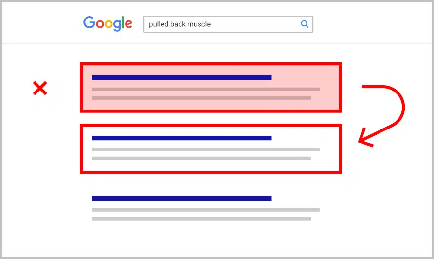 Ceux-ci sont connus comme des signaux d’expérience utilisateur (signaux UX). Regardons un exemple: vous vous êtes tiré un muscle dans votre dos en jouant au tennis, vous recherchez donc « tiré un muscle » dans Google. Comme la plupart des gens, vous cliquez sur le premier résultat. Malheureusement, l’introduction est pleine de contenu et de remplissage («Votre dos est un groupe musculaire important …»). Donc, vous appuyez sur le bouton de retour et consultez le 2ème résultat: